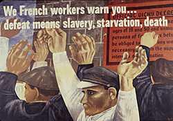 Thomas Hart Benton's The Sowers depicts grotesque images of German soldiers sowing skulls every bit seeds in a barren field, telling Americans that the High german military was sowing death in every country they conquered. And Ben Shahn created a affiche with the message: We French workers warn you . . . defeat ways slavery, starvation, death.